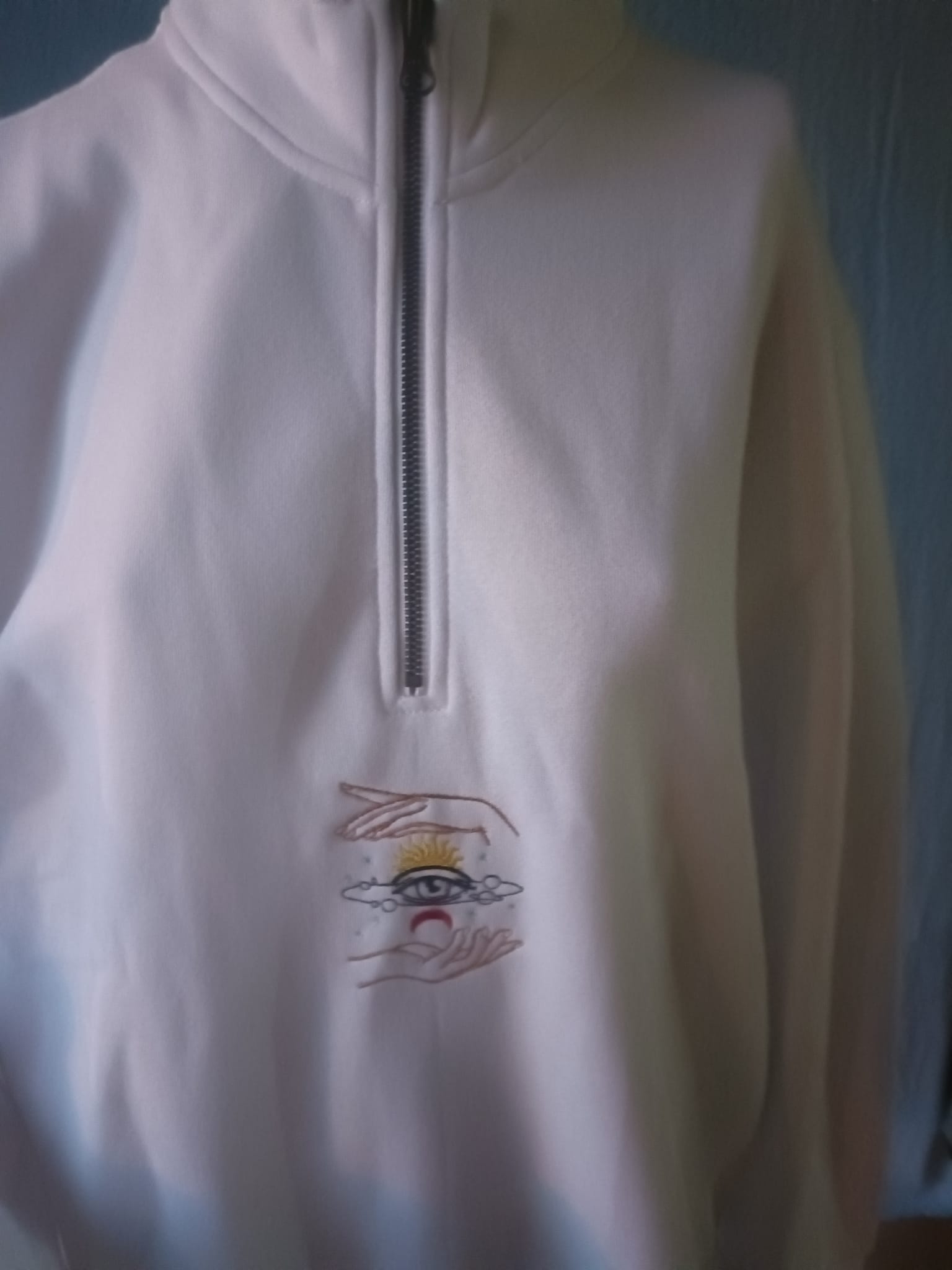 Este Half-Zip combina comodidad y estilo con un diseño único. Bordada a mano con una imagen con dos manos y un ojo en un elegante y delicado estilo, es perfecta para añadir un toque especial a tu look diario.
