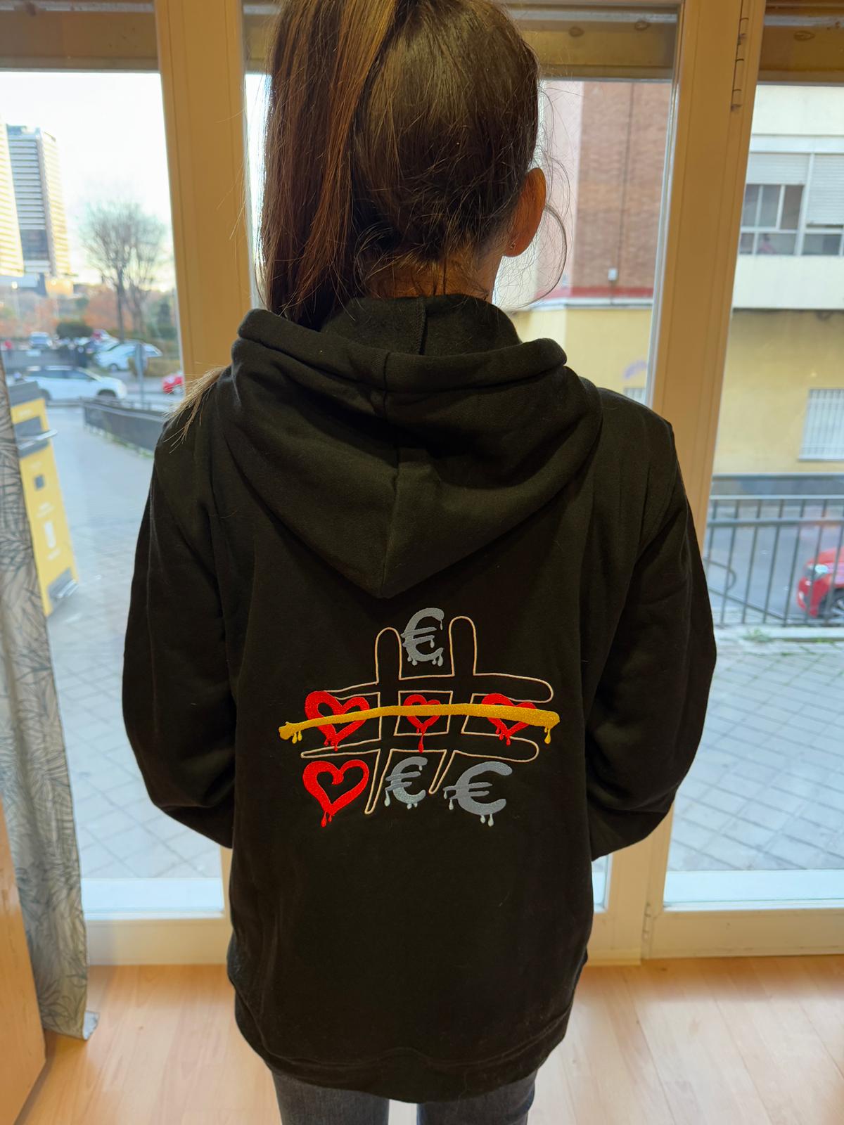 Cómoda y elegante, esta sudadera presenta un bordado artesanal con la palabra «3 en Raya», perfecto para un toque especial en tu día a día. Con materiales de alta calidad, capucha ajustable y bolsillo frontal, combina estilo y confort en una prenda única.